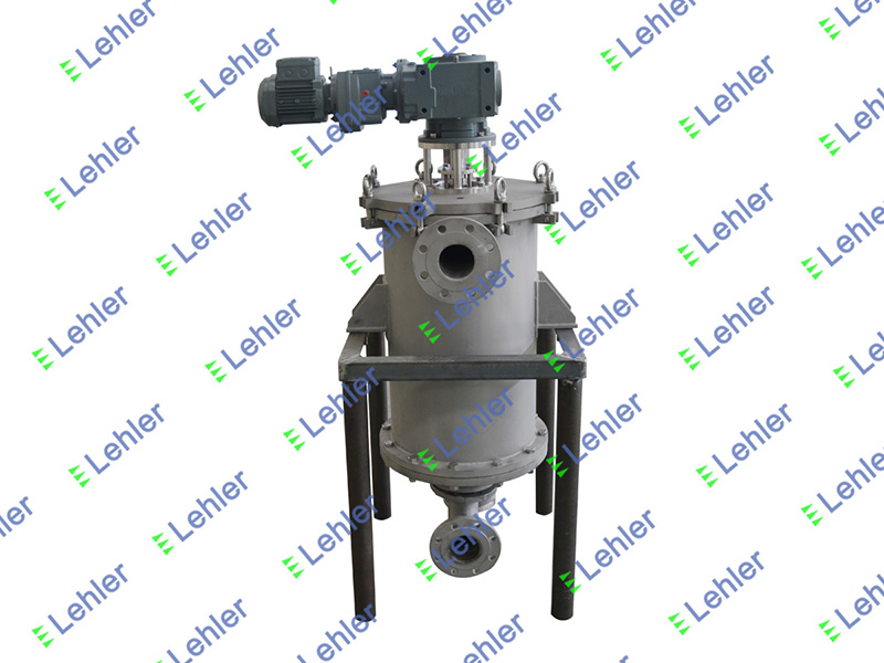液體從過(guò)濾器進(jìn)口從濾元外表面向內(nèi)流動(dòng),濾元下端連接出口,液體從出口流出;當(dāng)濾元表面攔截到量雜質(zhì)時(shí),定時(shí)或按設(shè)定壓差開(kāi)始執(zhí)行清洗程序,減速電機(jī)驅(qū)動(dòng)斜貼于濾元外表面的刮刀旋轉(zhuǎn),刮除濾元外表面的雜質(zhì),雜質(zhì)沿著刮刀離開(kāi)濾元表面,隨下行液體落入過(guò)濾器底部,旋轉(zhuǎn)掃板將底部重質(zhì)雜質(zhì)掃入集污腔,雜質(zhì)積聚于集污腔以及過(guò)濾底部,排污閥定時(shí)自動(dòng)打開(kāi),將含高濃度雜質(zhì)的液體從排污口排出,如有必需,排出殘液可回收。